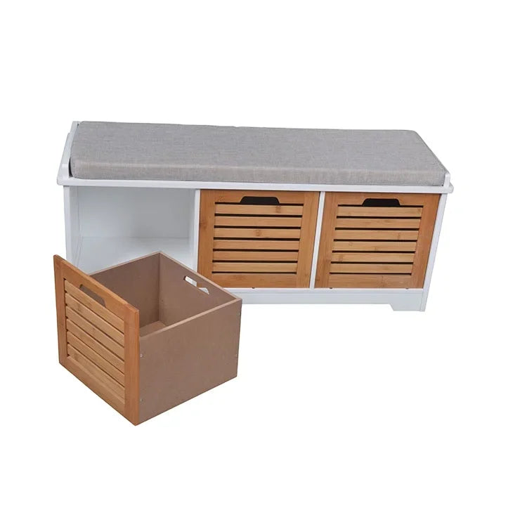 Entryway Hallway Furniture Wooden MDF Bamboo Storage Ottoman with Soft Seat Cushion Shoe Cabinet with Louver Drawer